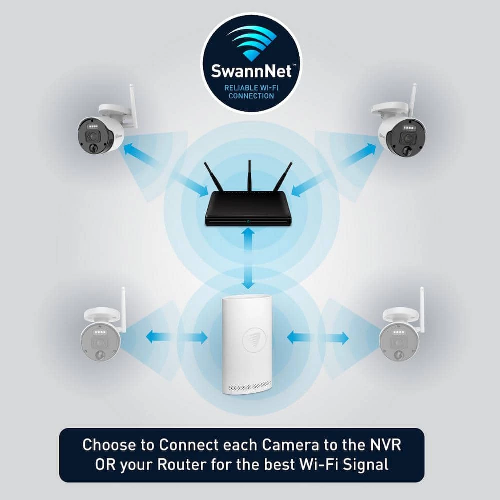 The Wi-Fi NVR Security System has crime-fighting features other systems envy. With bright spotlights, 2-way audio and loud sirens, you can intimidate intruders and prevent crime from happening. These features are controllable remotely in the Swann Security app. You get free local recording for up to 180-days plus onto the massive 1TB hard drive and the option to backup video to your Dropbox account. Know what’s happening at any-hour with powerful infrared night vision up to 100 ft./30 m and Night2Day gives you amazing color video at night up to 32 ft./10 m. Swann’s True Detect heat and motion detection senses people and cars for more reliable monitoring and fewer false alarms. The cameras plug into power while their video signal back to the NVR is transmitted wirelessly, so you don’t have to worry about drilling into walls and running cables anywhere. The NVR connects to your internet router via the included network cable or Wi-Fi, while the new SwannNet technology allows you to select whether each camera connects to the NVR or your home Wi-Fi, meaning you can choose whichever network has a stronger Wi-Fi signal. This gives you greater flexibility to place the cameras where they need to be, and their robust indoor/outdoor design is built to withstand rain, snow and heat, all-year round.