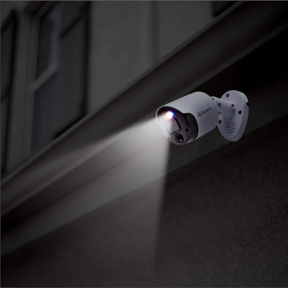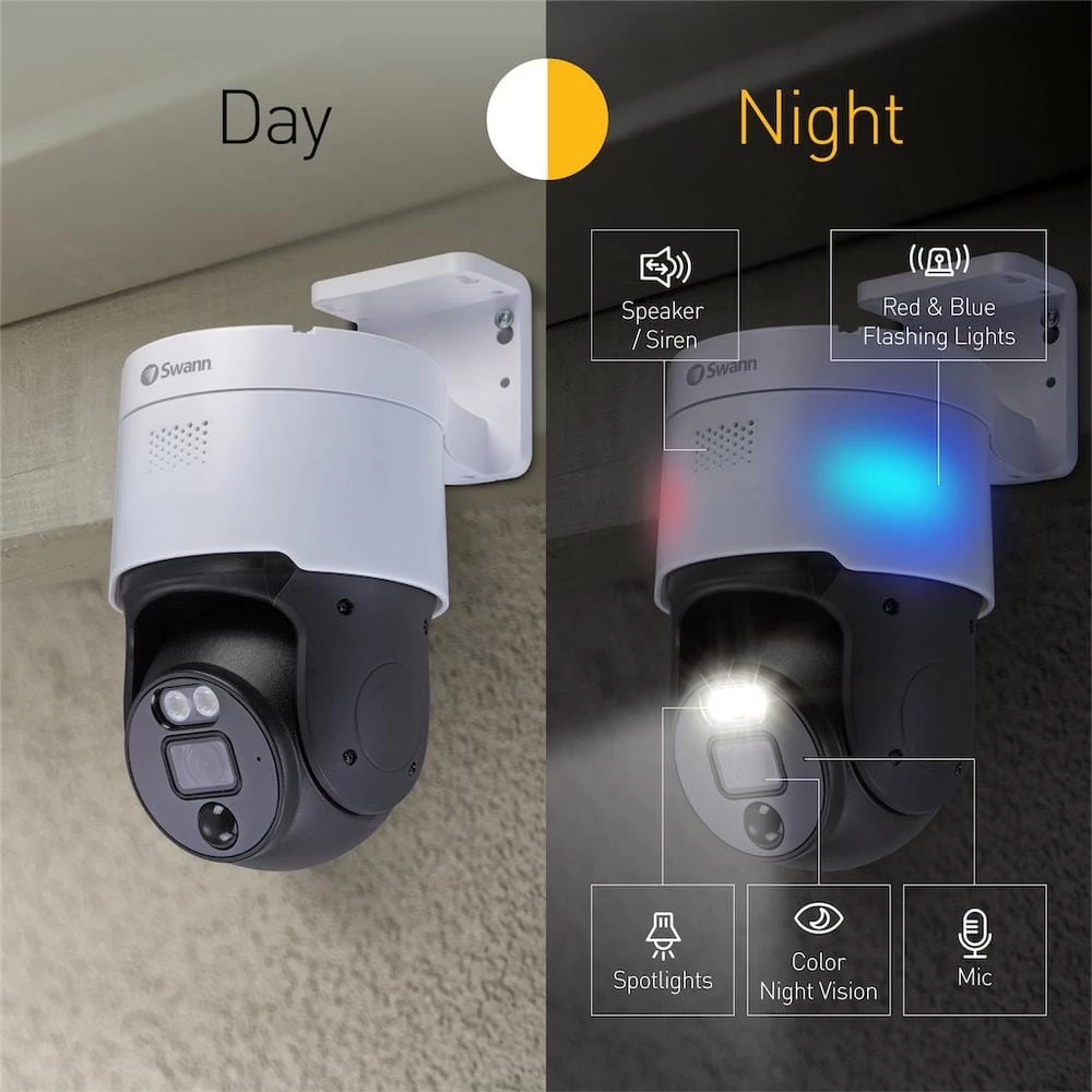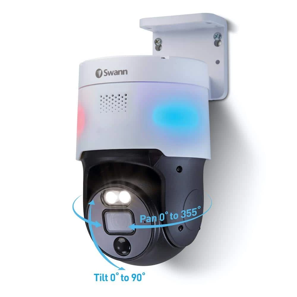 The Pro Enforcer NVR system has Swann’s ultimate suite of Advanced Analytics. Perfect for your home, or small to medium sized businesses. red and blue flashing lights, spotlights and sirens to prevent crime. See fine details via 4K UHD video and watch live on your smartphone or smart TV. With color night vision, heat and motion detection in weatherproof cameras, the Pro Enforcer is the ultimate security solution. The 4K Pan & Tilt Camera has bright spotlights, red & blue flashing lights, 2-way audio, and a loud siren, so you can intimidate intruders and prevent unwanted activity, and these features are controllable remotely in the Swann Security app. The Pan & Tilt function enables you to control the field of view remotely, so you can pan horizontally 355° & vertically 90°.