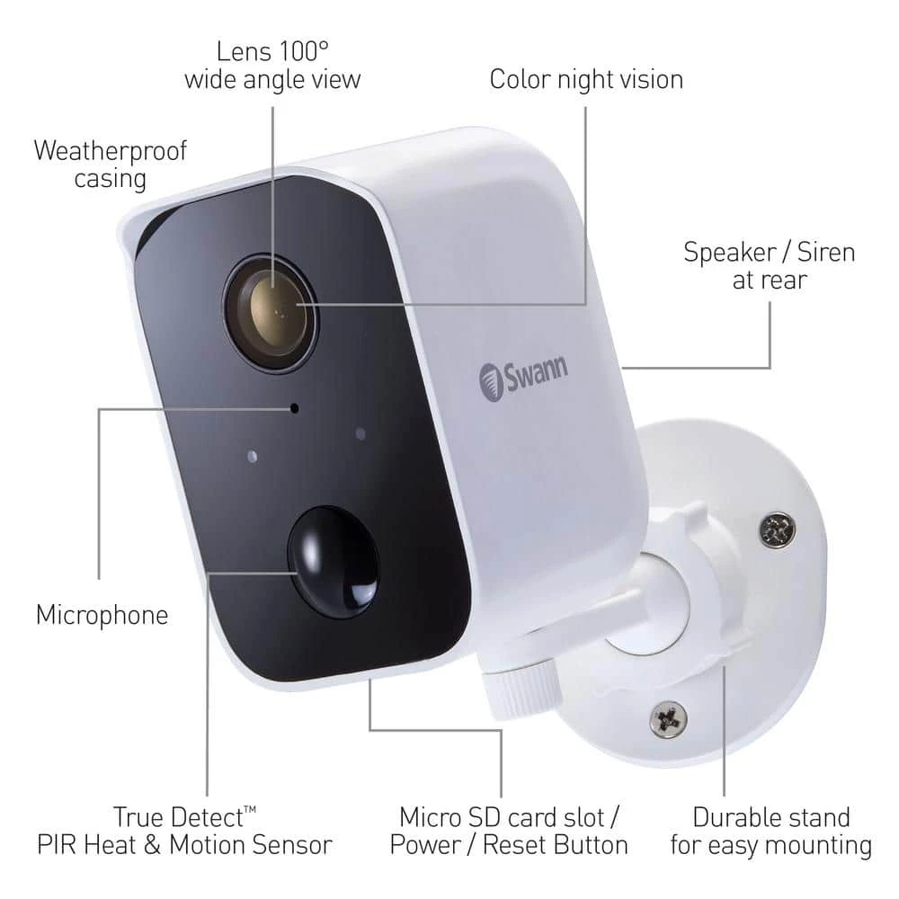 CoreCam Security Camera is designed for people needing easy-to-install, completely wireless security, and it can operate for up to 3-months on a single battery charge, This 3-pack of cameras features stunning 1080p Full HD video in a compact modern design. Secure it with the screw-in mount to watch over any area from any angle. The weatherproof design is built to withstand rain, snow and heat, and see in the dark up to 26 ft. (8 m), with powerful infrared night vision that kicks in automatically, Sleep comfortably knowing the CoreCam Security Camera is looking out for you. The 2-way audio feature allows you to have a presence at your home giving you peace of mind while you’re away, you can even scare off intruders by activating the siren from your phone. Swann’s True Detect Heat and Motion Detection triggers video recording and push notifications straight to you. Use voice commands via Alexa and Hey Google to see what’s happening hands-free, CoreCam has free storage allowing you to store thousands of clips onto the included 32GB Micro SD card plus there’s short term 1 day storage to the cloud. Secure to the core with long battery life for extra convenience, let the CoreCam Security Camera look out for your family and property. It’s security made smarter, from Swann.