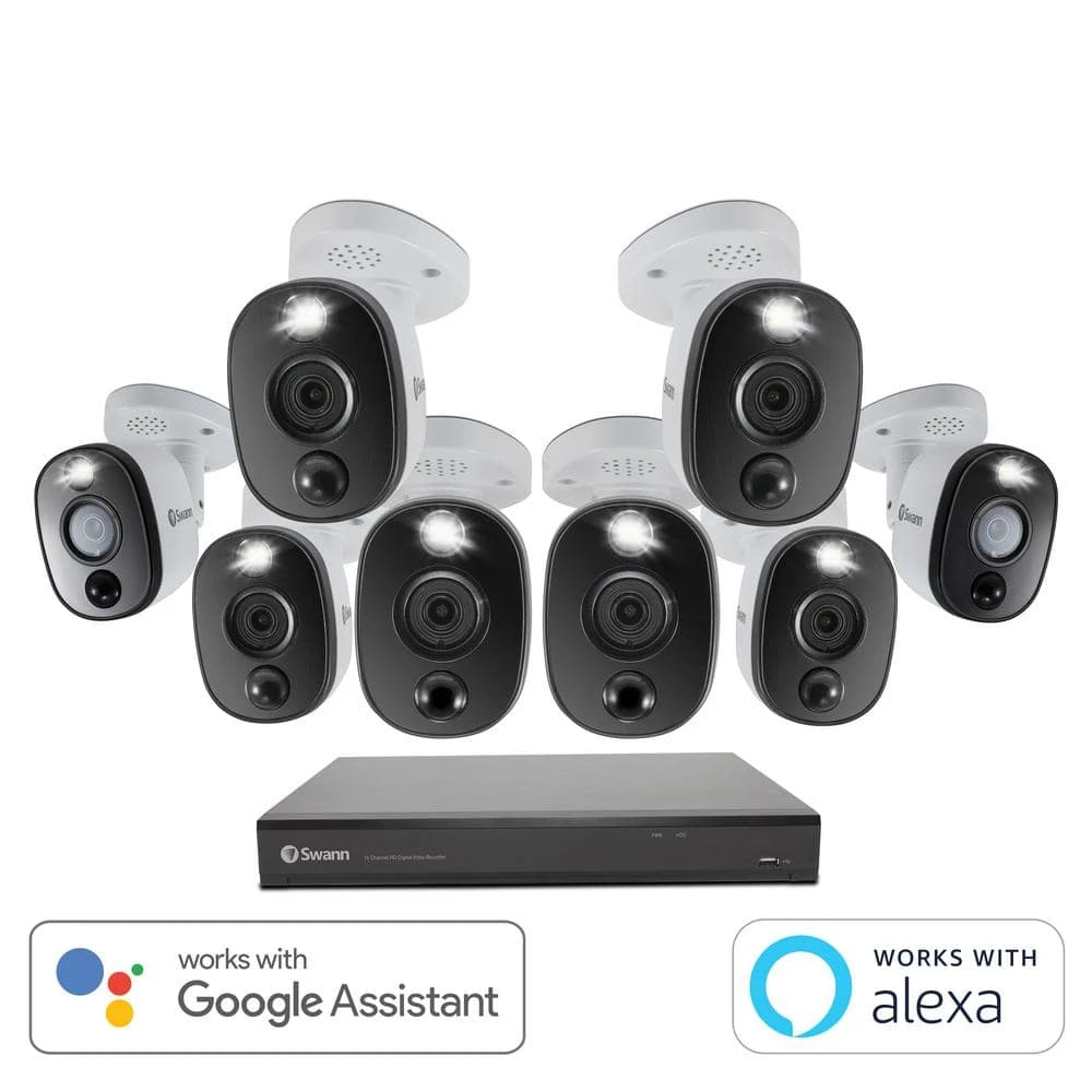 This security system is packed with the latest CCTV technology, such as weatherproof cameras with colored night vision, bright warning lights, push notifications, Dropbox integration and compatibility with the Google Assistant for voice control. Get amazing detail with 4K Ultra HD which is 4X the resolution of 1080p Full HD. Zoom in closer with unprecedented clarity to essential evidence such as license plates and facial features. See your home on your phone, live or playback, from anywhere with the Swann Security app, while the massive pre-installed hard drive can store months of footage with no ongoing fees ever.