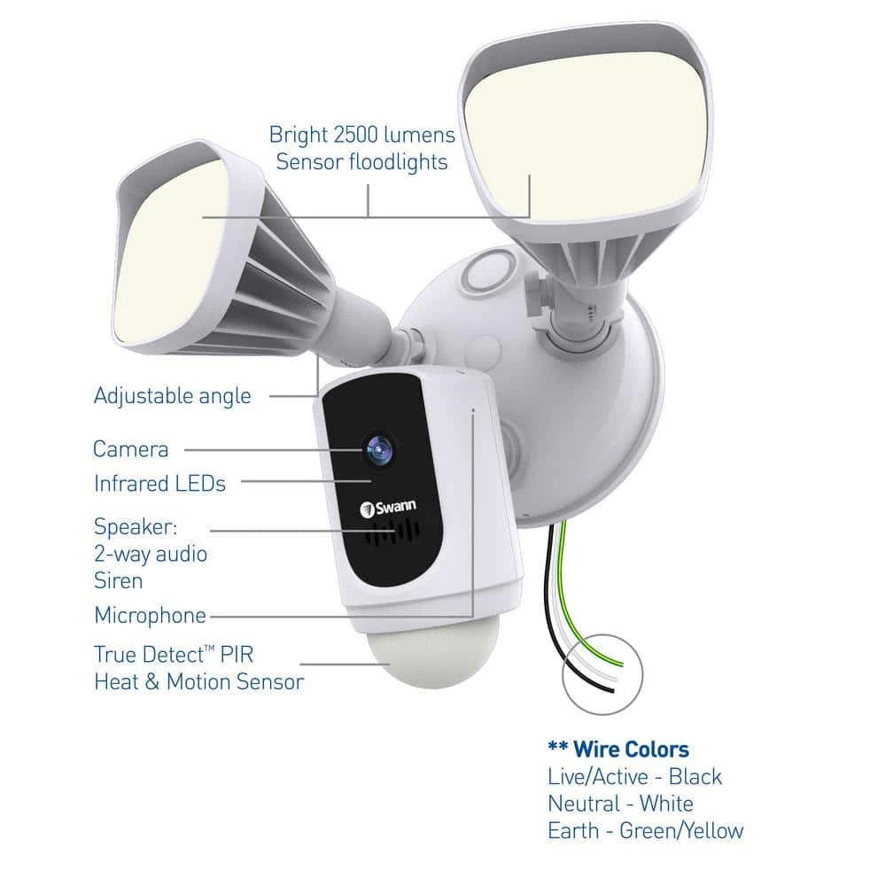 Swann’s Floodlight is Everything a Burglar doesn’t want. Evidence. Visibility. Interaction. Warning. Its the ultimate deterrence with powerful floodlights, 2-way talk, video recording and siren combining to ensure your property wont be an easy target. They have nowhere to hide. The super-bright floodlights shine 2500 Lumens and enable color night vision up to 100 ft. (30 m), so you can identify people, cars and more, at any hour. Unlike other floodlights, you can control the brightness. Dim the floodlights to a comfortable level within the app. Great for use in entertainment areas. You have choices in where to store footage. So you never miss a thing with video clips saved to local memory for 7-days and secure cloud for 2-days for free, with the ability to expand that to 30-days cloud recording via subscription service.